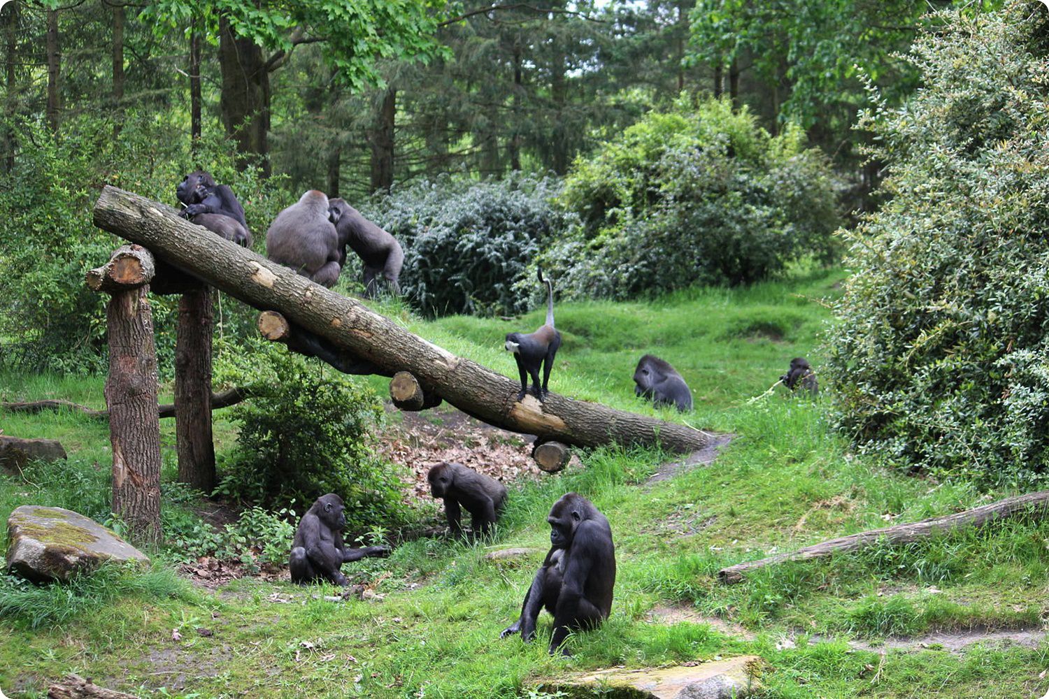 A jobboldali fotón Jambo, a jelenlegi ezüsthátú látható. A vezérhím 2006-ban érkezett a Krefeldi Állatkertből. Alul szintén a gorillák szigetét láthatjuk az állatkert más-más pontjairól.