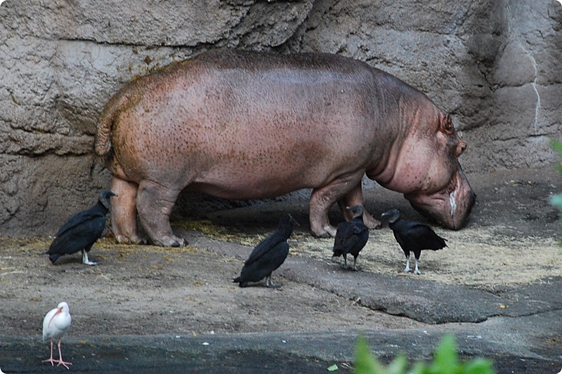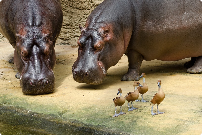 Those birds which are associated with Hippopotamuses in their natural habitat – i.e. herons, egrets, storks, spoonbills, geese and ducks – can also be seen together with hippos in captivity, many zoological institutions serve as examples for that.