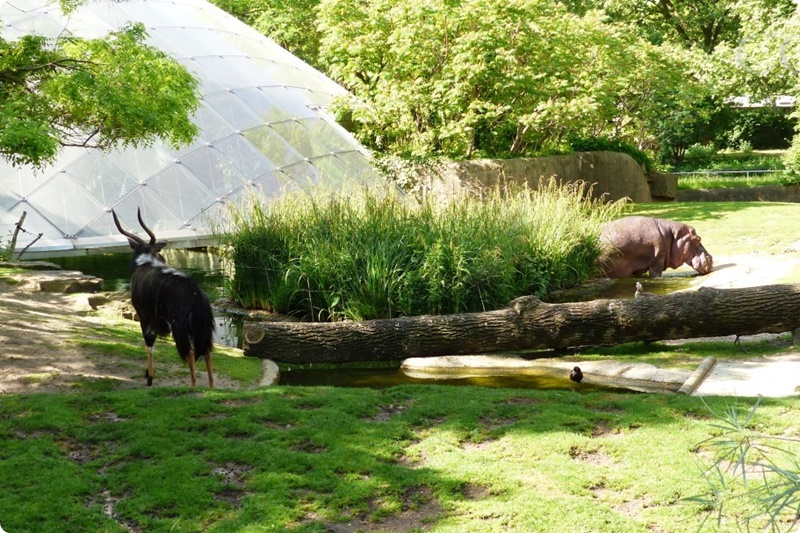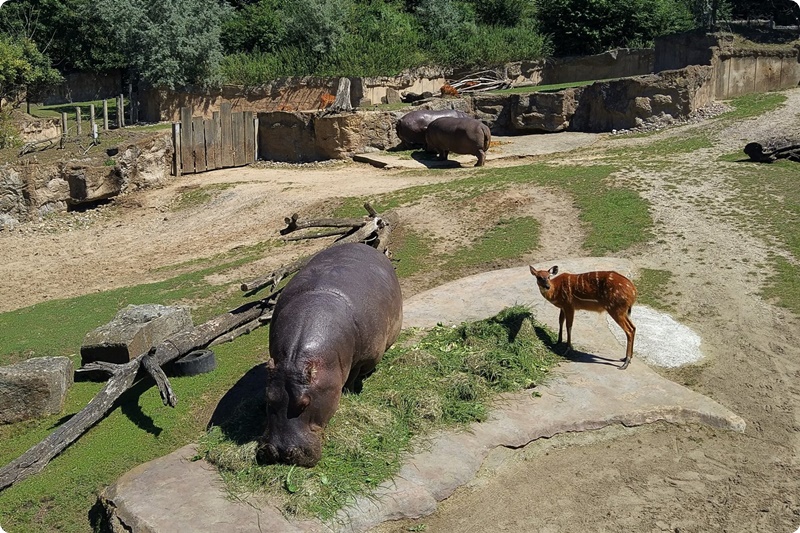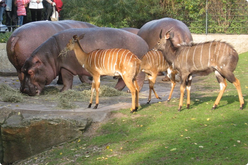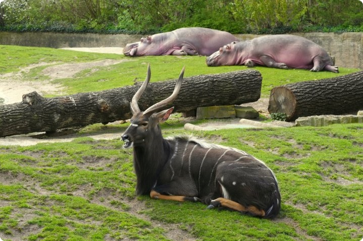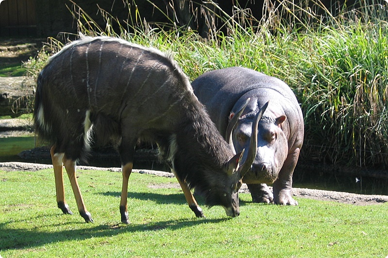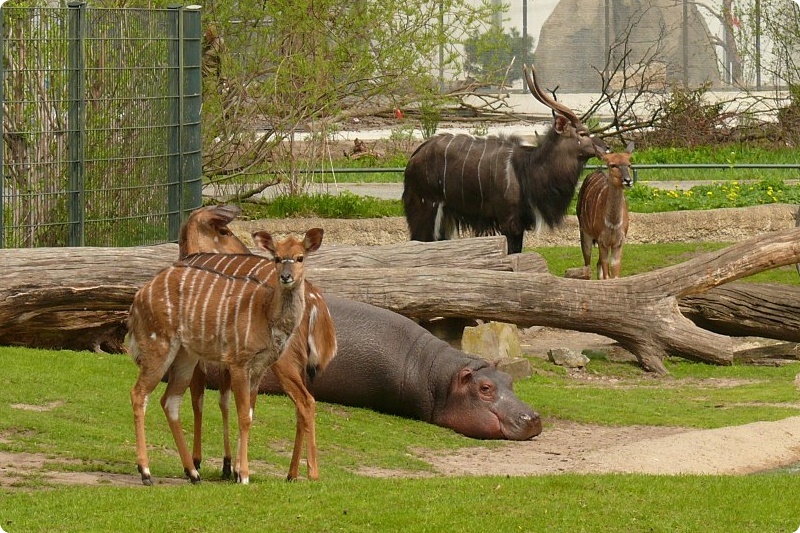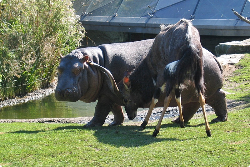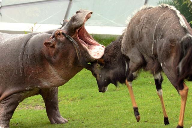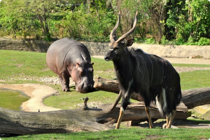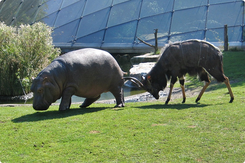 In smaller enclosures it is important to provide retreats that can only be visited by the subdominant animal species. In Zoologischer Garten Berlin the outdoor enclosures of the Hippopotamuses and Nyalas are adjacent to each other. The antelopes can enter the Hippopotamus enclosure, but can retreat into their own enclosure at any time behind a barrier that is insurmountable for the hippos. The aggressive Nyala buck procures escape into the pool by targeted attacks with violent horn blows into the flanks or the hindquarters of the Hippopotamus (ZSCHEILE & ZSCHEILE 2018).