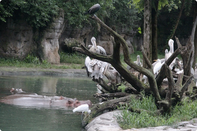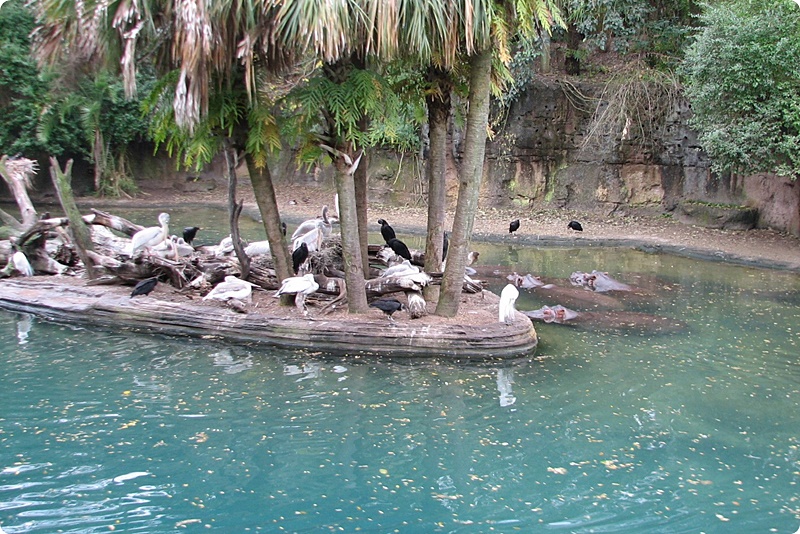 In Disney’s Animal Kingdom Theme Park two groups of Hippopotamuses (1.7 or 5.0) have been successfully mixed with Pink-backed Pelican (9.7.2), White-breasted Cormorant (2.2) and with other birds in the past. Hippos are in two separate exhibits and the birds can all move freely from the two enclosures. There are several islands in the deeper water that it is hard for the Hippopotamus to navigate or approach and several logs have also been placed in the exhibit to provide safe places for the birds away from the hippos; this was the key of the success when pelican chicks were hatched as well. The Hippopotamus often become territorial and a few pelicans have been attacked by the hippos when birds get too close to them. In a smaller exhibit another group of Hippopotamus (2.0) has been successfully mixed with White-eyed Duck (1.1) and Tufted Duck (4.2). Ducks were breeding: nest boxes were placed in the exhibit and fixed to the walls so hippos could not move them (AZA Ungulate TAGs 2017).