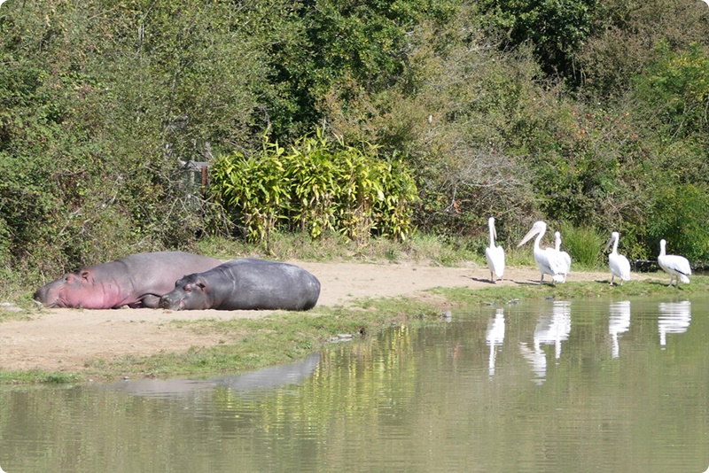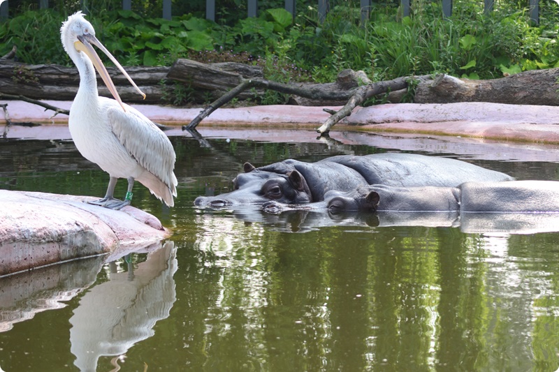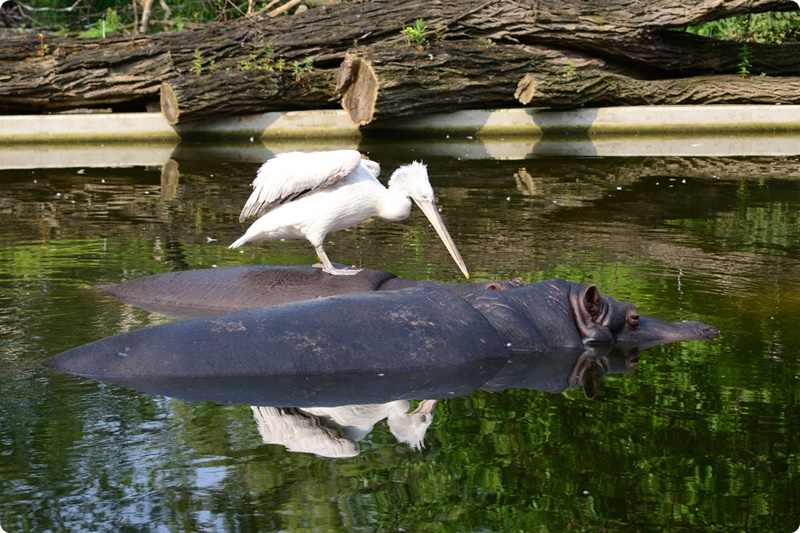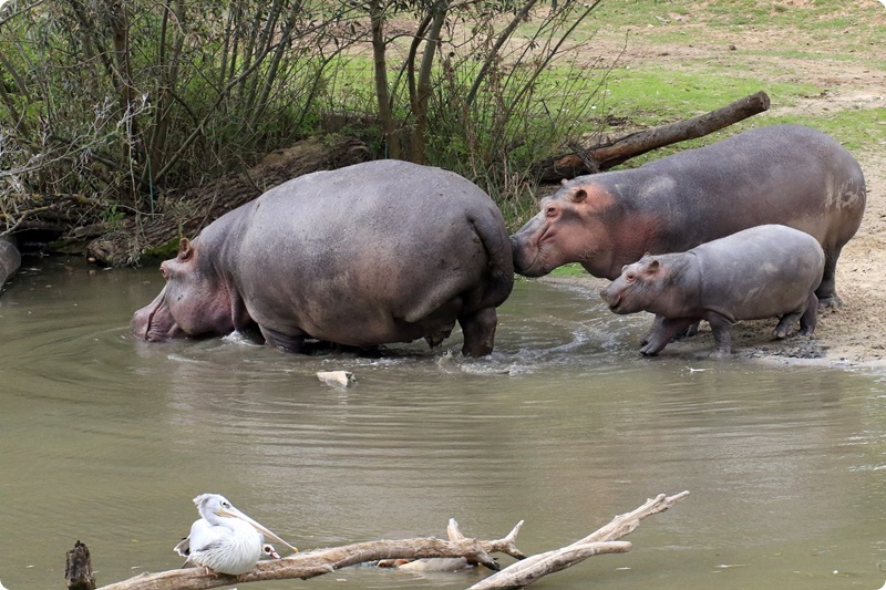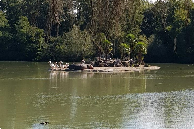 Parc Le PAL has a very successful mixed exhibit, where Hippopotamuses and Great White Pelicans coexist together perfectly. Beyond a passive cohabitation there are regular interactions between the species: it is not uncommon to see a pelican on the back of a hippo or even the birds are seeking in the mouths of Hippopotamuses. Whether it is on the water or on their island that they all share together, a negative interaction has never been reported. The size of their enclosure – 1,5 hectare and a lake is 1 hectare – probably contributes to the tranquility of the animals (GÉLI 2020, pers. comm.).