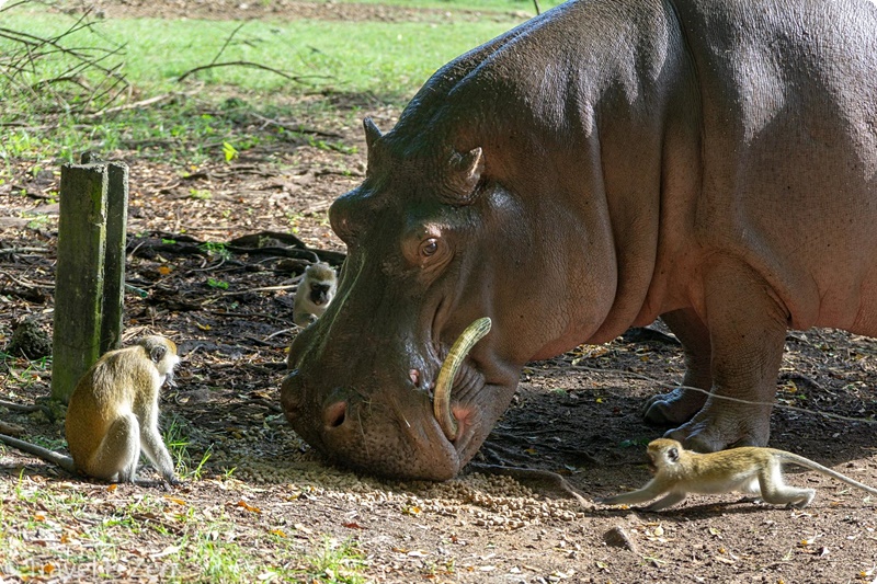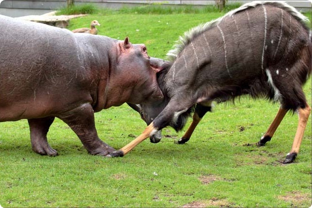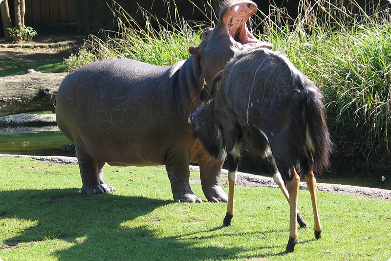 In nature frustrated Hippopotamuses – particularly younger males – have been known to vent their aggression on other species (KINGDON 1979).