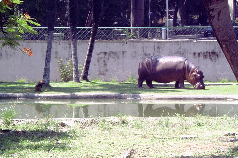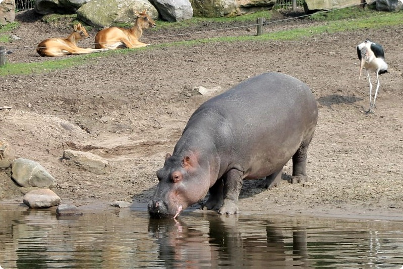 Hippopotamuses can be very dangerous animals so in former times it was thought that they cannot be combined with other species in captivity (PUSCHMANN 1983). The other basic reason to have not associated them with other taxa was keeping them mostly in small indoors where no space was available for other species. Later on this has changed and huge outdoor enclosures and aviaries as well made it possible to combine them principally with primates and ungulates, but with many species of birds and fish as well. Just as a point of interest GRZIMEK (2000) reported a friendship of an adult female Hippopotamus – which was kept alone in Zoologischer Garten Halle – with a dog which was allowed to crawl into the hippo’s mouth and licked there. Worth mentioning that especially young and playful hippos turn to other species in the absence of playmates and they particularly profit from cohabitations established in mixed exhibits (HAMMER 2002).