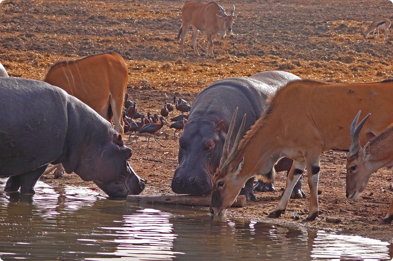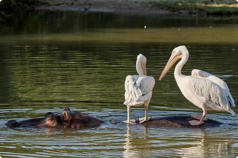 Studies have shown that many African birds have been observed to help groom Hippopotamuses by feeding on insects and parasites from the hippo’s back. The most frequently observed bird species are the Common Sandpiper (Actitis hypoleucos), African Pied Wagtail (Motacilla aguimp), Yellow-billed Oxpecker (Buphagus africanus) and Red-billed Oxpecker (Buphagus erythrorynchus) (OLIVIER & LAURIE 1974). Hippopotamuses and oxpeckers are in a mutualistic and parasitic relationship: this is because the oxpecker gets food and protection from the hippo, however, the bird gets food by making little cuts in the Hippopotamus to obtain insects.