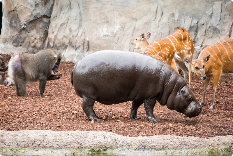 In the Tropic World Africa exhibit of Brookfield Zoo a Pygmy Hippopotamus (0.1), Talapoin Monkey (various groups), Sykes’s Monkey (3.2), Red-tailed Monkey (1.3), Sooty Mangabey (1.4), Red-capped Mangabey (5.0 or 4.0 or 2.0), Mandrill (1.3), Guereza (3.4) and birds (23 species) were successfully mixed for 16 years. Hippo was always introduced first to new primate species. The institution has only ever maintained one female hippo at a time, but has had three different hippos there from 1982-2012. The addition or removal of primates had no consequence to that of the hippopotamus at the time. The staff had no problems with hippos, but from time to time the monkeys – i.e. Red-capped Mangabeys – harassed the Pygmy Hippo mildly to which she would go back to the pool until the monkey lost interest. In general, all primates and the hippo coexisted without problem. The institution did not stop exhibiting the hippo in this exhibit for lack of success: the management decided to exhibit the species in just one area of the zoo so the Pygmy Hippopotamus has been moved to the Pachyderm House in 2012 (AZA Ungulate TAGs 2017).