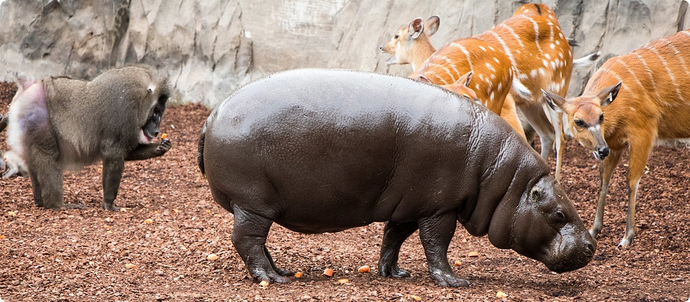 Zoologischer Garten Halle has lots of experience keeping their Pygmy Hippopotamuses together with several species of New and Old World Monkeys as well. Since 2000 a mixed group of callitrichids – Saddleback Tamarin (0.0.9), Red-chested Mustached Tamarin (1.1) and Goeldi’s Monkey (1.1) – were associated with Pygmy Hippopotamus (1.1) in a 110 m³ indoor enclosure around a giant artificial tree. Later on a group of Mandrill (2.2) were kept together with the hippos only outdoors. The outdoor enclosure was 220 m² with two separated areas and pools for each Pygmy Hippo so the individuals were kept separately. Mandrills had access to the whole outdoor enclosure which was approximately 1000 m³. Both of the species had their own indoor enclosures. Mandrills approached the hippopotamuses to steal food and mutual threats were realized. In general association was not accompanied by major interspecific but by intraspecific problems: initial cohabitation of the two Mandrill pairs was not successful and animals had to be separated again (ZIEGLER 2002). So because of the aggressive male Mandrill the combination with Pygmy Hippopotamus did not work for a longer time (HEUER 2020, pers. comm.).