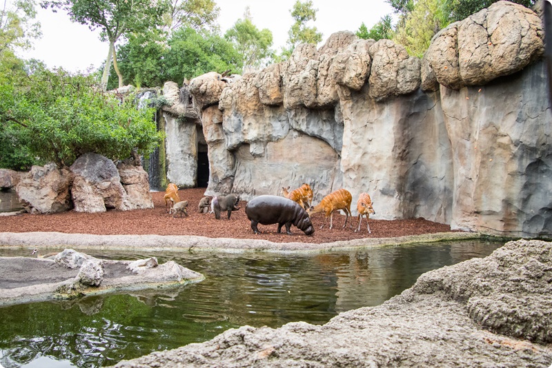 San Diego Zoo Safari Park has previously exhibited Pygmy Hippopotamus together with Grant’s Zebra, Grevy’s Zebra, Northern White Rhinoceros, Eastern Black Rhinoceros, East African Sitatunga, East African Eland, Topi, Defassa Waterbuck, Uganda Kob, Red Lechwe, Nile Lechwe, Common Impala, Thomson's Gazelle, Slender-horned Gazelle, Grant's Gazelle, Fringe-eared Oryx, Angolan Roan Antelope, Eastern White-Bearded Wildebeest, Cape Buffalo and Rothschild's Giraffe in a 36 hectare East Africa Exhibit. Over the years the institution has exhibited many of those species together at one time or another and never had any trouble with the hippos, but to tell the truth they mostly stayed on an island in the middle of the pond that was in the exhibit (BLUE 2008, pers. comm.).