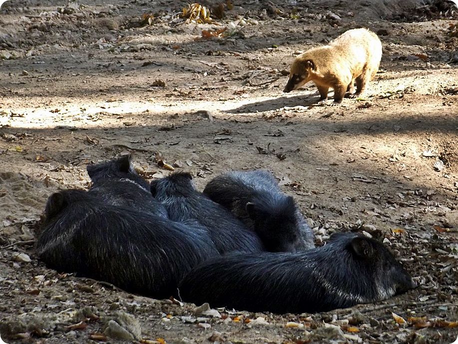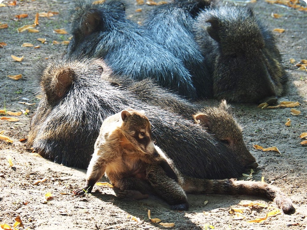 One of the most frequent associations is the Collared Peccary & South American Coati coexistence which has been tried in many institutions. In Zoo Salzburg Hellbrunn the coatis had their own enclosure but had access to the peccaries (HAMMER 2002).