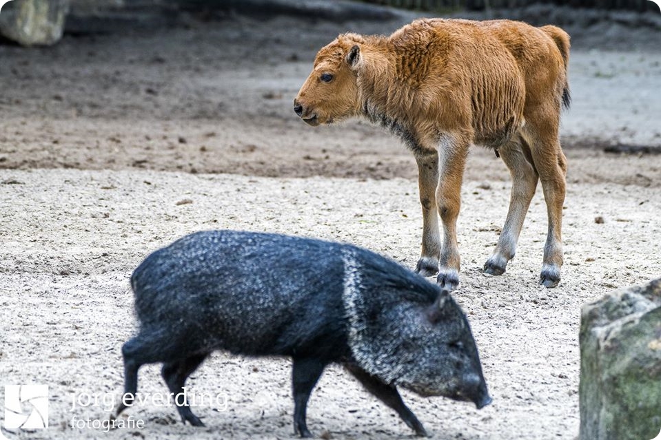 In Tierpark Nordhorn the Collared Peccary and Wood Bison mixed exhibit opened in 2012. Inside the stables the peccaries have about 14 m² available and the bison’s 80 m². The separation enclosures measured 92 m² and 33 m² in size. The mixed-species exhibit is approximately 1600 m², thereof 100 m² are retreat areas for the peccaries. On the opposite side of the main exhibit there is an additional space for the smaller species with a shelter. Wooden poles and electric fencing prevent the bison from entering this area. Keeping bison and peccaries together seems to be enriching for both species. Sometimes playful chasing behaviors have been observed between young bison and peccaries (HOMBURG, ZooLex 2019). The White-nosed Coatis are meant to have access to the peccary and bison mixed exhibit. A tunnel with slides to connect both areas was built under the visitor path. This cohabitation so far was not tested because it requires additional fencing in the mixed exhibit (HOMBURG, ZooLex 2020).