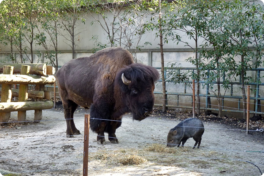 Collared Peccary (Pecari tajacu) and Wood Bison (Bison bison athabascae) mixed exhibit