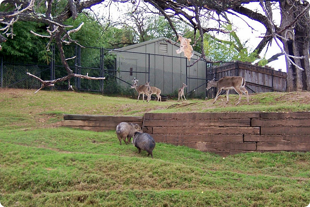 Cameron Park Zoo had a mix of female Collared Peccaries (0.2), a group of White-tailed Deer (2.3) and a pair of Wild Turkey (1.1). The first group the zoo had from 1993-2005 were hand-reared and did well; they even socialized with the deer. The last group the institution had from 2005-2008 were parent-reared and aggressive to all exhibit-mates (AZA Ungulate TAGs 2017).