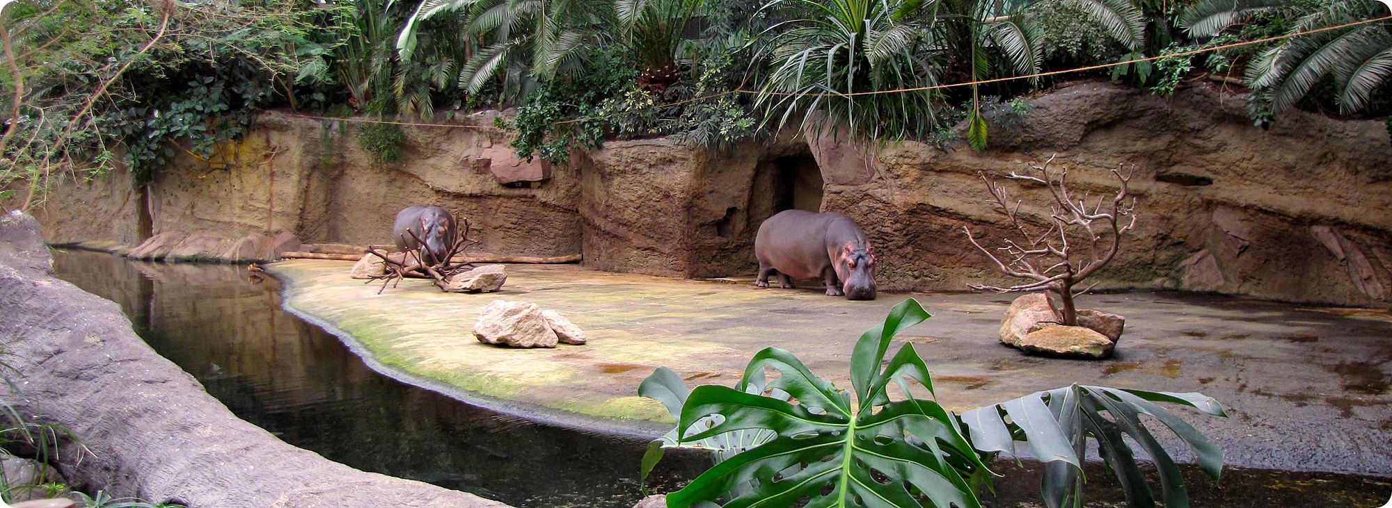 A vízilovak 220m2-es belső férőhelyüket és a hozzá tartozó 580 m³-es medencéjüket nílusi tilápiákkal (Oreochromis niloticus) és sujtásos fütyülőludakkal (Dendrocygna bicolor) osztják meg.