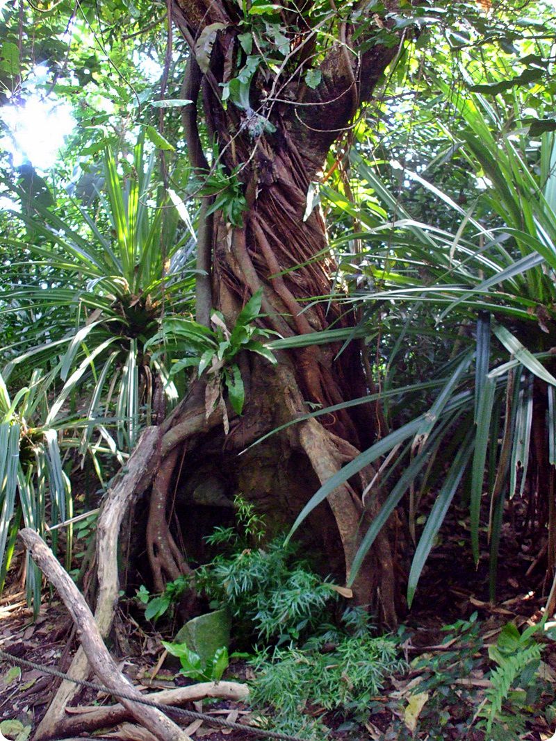 A csavarpálmák nagy tömegben képviseltetik magukat a csarnokban, hangulatosan övezve a látogatói útvonal számos szakaszát. Az alsó felvételen a Madagaszkáron előforduló faj, a Pandanus utilis, és annak szerteágazó támasztógyökerei láthatóak.
