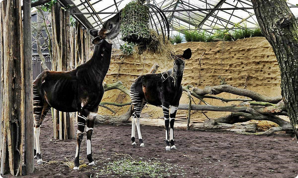 E francia bemutató alapötletét kölcsönözve készült el a rotterdami Kongó-bemutató is: a korábban „Vándormadarak” nevet viselő, honos madárfajokat bemutató külső óriásröpde szolgál jelenleg az okapik bemutatására, melyben szintén számos afrikai madárfaj került beszoktatásra, mint például szürkenyakú koronásdaru (Balearica regulorum regulorum), koronás bíbic (Vanellus coronatus), kármin gyurgyalag (Merops nubicus), perzsa turákó (Tauraco persa persa), viola turákó (Musophaga violacea), barna lármásmadár (Corythaixoides concolor), pompás fényseregély (Lamprotornis superbus), barna bülbül (Pycnonotus barbatus), bóbitás gyöngytyúk (Guttera pucherani) és törpegém (Ixobrychus minutus). A röpdéhez kapcsolódó, megelőzően növénybemutatóként és lepkekertként funkcionáló üvegházak pedig tágas, természetes talajborítással rendelkező belső férőhelyeket és istállókat nyújtanak az „erdei zsiráfok” számára. A Rotterdami Állatkertben 1957-től napjainkig folyamatos az okapik tartása és tenyésztése, melyet mindössze két év szünet (2013-2015) szakított meg a szükséges területrendezések miatt. Érdemes megjegyezni, hogy a Blijdorp a világ harmadik legeredményesebb okapitenyészetét tudhatja magáénak: 1960-tól kezdődően összesen 43 okapiborjú látta meg itt a napvilágot, melyet csak az Antwerpeni Állatkert és a floridai White Oak Conservation Center előz meg 50, illetve 45 születéssel.