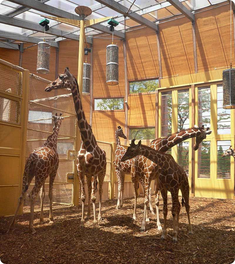 Érdemes néhány szót ejteni a Zsiráfház belső szerkezeti kialakításáról, mely lehetővé teszi a zsiráfok igény szerinti elkülönítését. A felvételeken és az ábrán látható fix elemek rányitható ajtókkal rendelkeznek, így számos opció áll rendelkezésre a belső tér tagolása tekintetében. A látogatók a kifutó nagy részén és az épületben is emelt útvonalról tekinthetik meg az állatokat. Az alsó felvétel és ábra forrása © LAM Architects