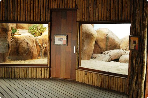 A Krokodilfolyó előcsarnokában a bőrpáncélosgyíkok és Peters-elefántcickányok számára kialakított kisebb kopje-bemutatók remekül illeszkednek a nagy csarnok sziklaformációihoz. A jobb oldali férőhely korábban hosszúfülű sünök (Hemiechinus auritus) és szürke csicsörkék (Serinus leucopygius) társas bemutatójaként funkcionált. A bal alsó felvétel forrása © www.zoochat.com