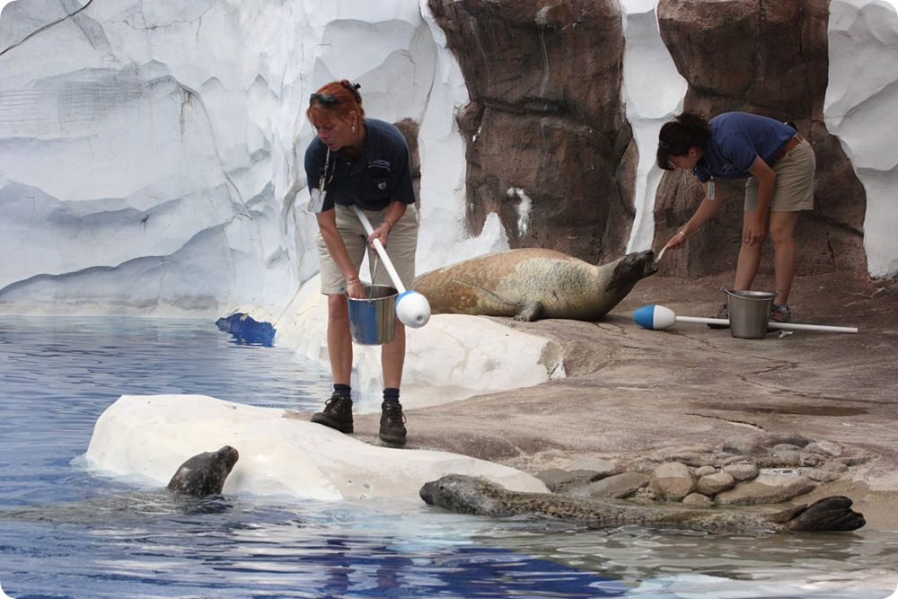 Habár az oroszlánfókák és delfinek közös tartása a legtöbbször préblémamentes és egy igen attraktív bemutatót eredményez, a vezető delfintrénerek hangsúlyozzák, hogy a fókáknak elegendő számú helyen el kell tudniuk hagyni a vizet szükség esetén. E menekülési pontok igen fontosak, mivel a delfinek néha igen durván játszanak. Továbbá ajánlott a borját nevelő nőstény oroszlánfóka elkülönítése mindaddig, amíg a fiatal fóka elég gyors a delfinek elől történő meneküléshez (HAMMER 2002).