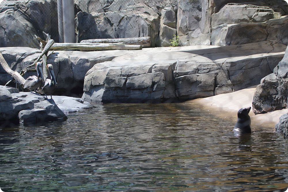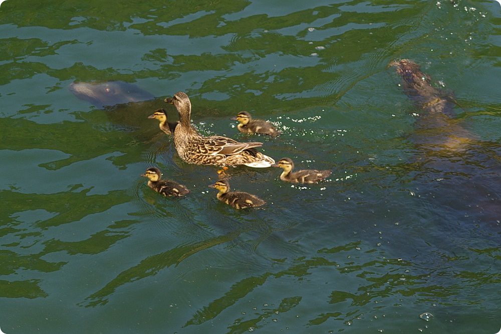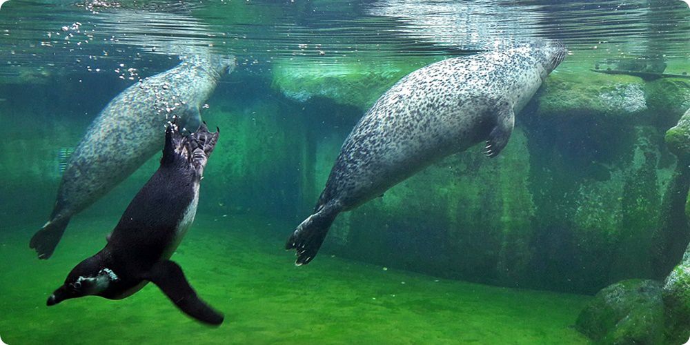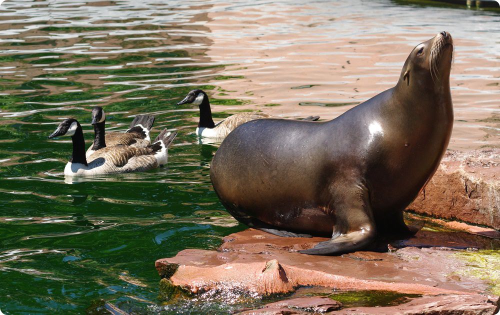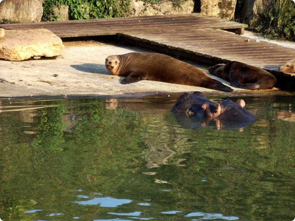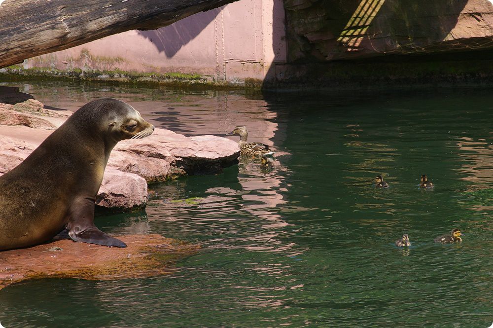 Nürnbergben kaliforniai oroszlánfókák szaporodó csapata látható együtt két nőstény borjúfókával, mely problémamentesen működik. A bemutatóban nem szándékolt társítás eredményeképpen időnként több madárfaj – szürke gém, kanadai lúd és tőkés réce – egyaránt megfigyelhető. A récék már szaporodtak és neveltek fel fiókákat. A fiatal oroszlánfókák lenyomták a réce fiókákat a víz alá, majd hagyták őket ismét a felszínre jönni. E rendszeres és durva játékos magatartást azonban sikeresen túlélték a fiókák (MÄGDEFRAU 2018, sz. k.).