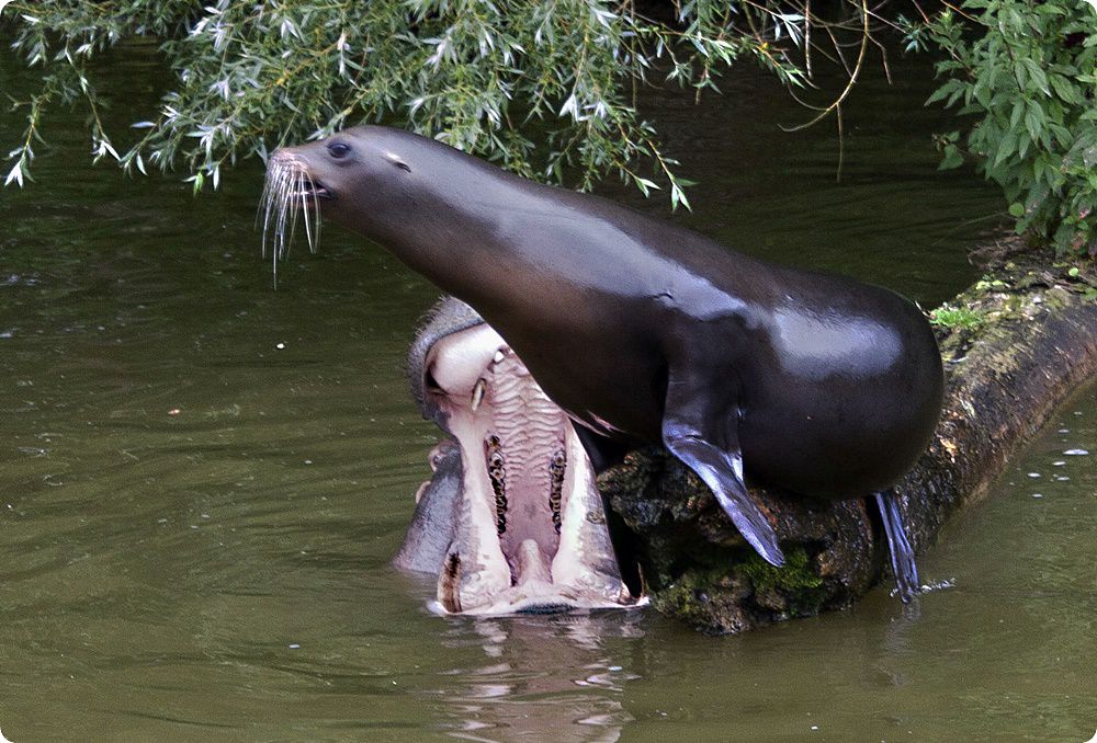 A Los Angeles Zoo vízidisznókkal társította kisebb kaliforniai oroszlánfóka (1.2) csapatát néhány évtizede, ahol megfigyelhető volt a fajok közös merülése és úszása. Egy kifejlett nőstény kapibara aggresszív magatartást tanusított egy a csapatba frissen beszoktatott fiatal hím fókával szemben melyet ki kellett venni ezért a csapatból (CROTTY 1981, HAMMER 2002).