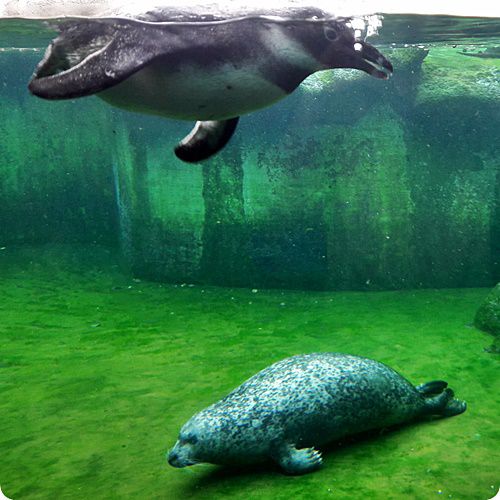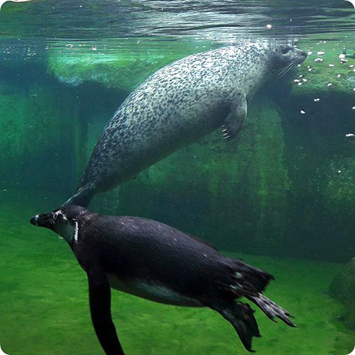Borjúfókák (Phoca vitulina) és pápaszemes pingvinek (Spheniscus demersus)