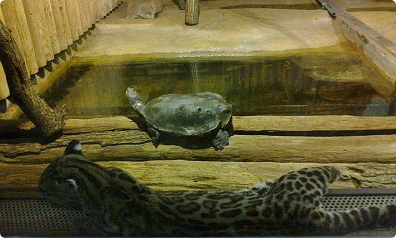 A Brno-i Állatkertben a hosszúfarkú macskák és egy sötét varangyteknős együttélése problémamentesnek nevezhető (GREMLICOVÁ 2018, sz. k.). A fajok csupán a belső férőhelyen osztoznak.