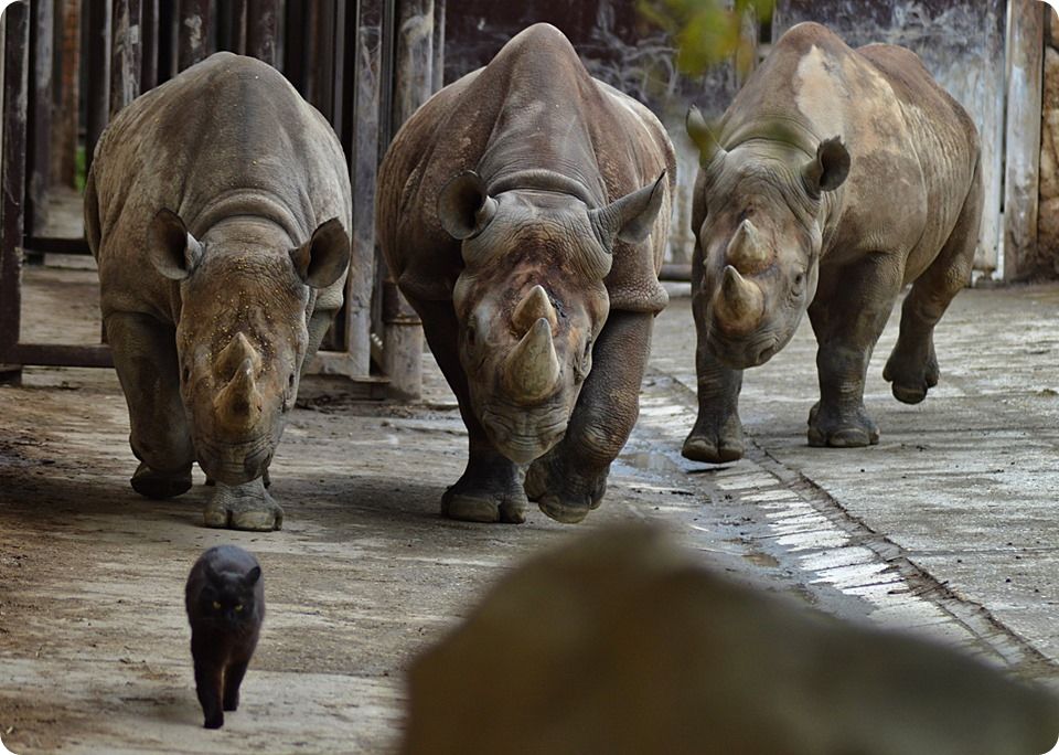 Lent: a spontán, átmeneti "társítás" egy további példája, házi macska és keleti keskenyszájú orrszarvúk (Diceros bicornis michaeli)