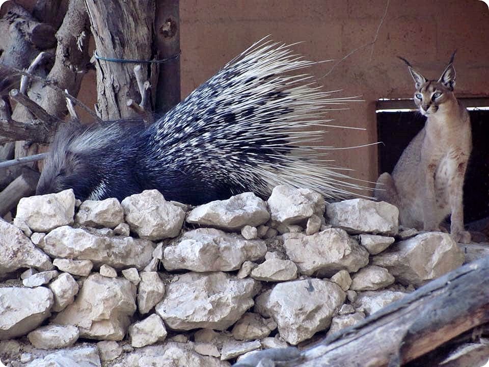 Karakál (Caracal caracal) és indiai tarajossül (Hystrix indica)
