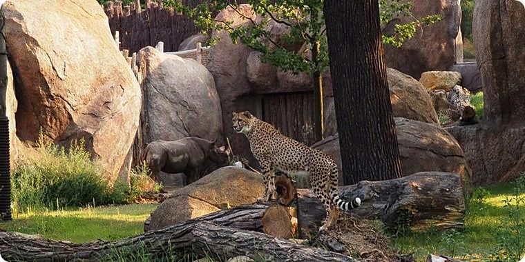 A Lipcsei Állatkert 2015-ben átadott „Kiwara-Kopje” elnevezésű bemutatójában sor került gepárdok, keskenyszájú orrszarvúk és huszármajmok közös elhelyezésére, ahol a macskák számára „rinocérosz-mentes”, míg a főemlősök részére „gepárd-mentes” zónák kerültek kialakításra. Mindaddig nem is volt probléma, míg az orrszarvúk csak az egyik említett fajjal kerültek közös férőhelyre. A problémát a gepárdok és majmok összeengedése okozta: a menekülési helyzetben a huszármajmok ösztönösen a futást választották a fára mászás lehetősége ellenében, így nem érték el a számukra „kijelölt” védőzónát. A gepárdok szisztematikusan együttműködve „vadásztak” a majmokra, s a huszármajom vezérhím fenyegetően próbált fellépni a ragadozókkal szemben. Mindezek együttesen már a bevezetési szakasz elején látatták a két faj társításának sikertelenségét, ám szerencsére megjegyezhető, hogy egyetlen majom sem sérült meg e rövid periódus alatt (HOLLAND 2018, sz. k.).