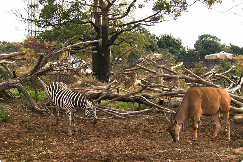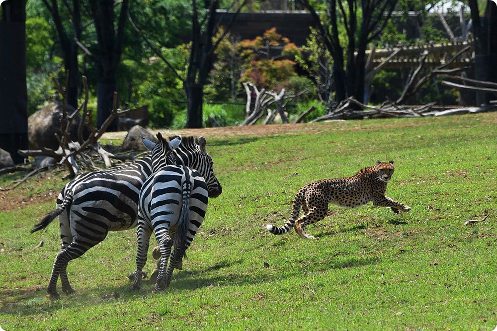 Az előző példánál is komplexebb társaskifutó létrehozásáról kell említést tennünk a Yokohamai Állatkertből: az intézmény 2015-ben megnyitott „Afrikai szavanna” bemutatója egy területen mutat be gepárdokat, zebrákat, jávorantilopokat és zsiráfokat. Ez tekinthető az első alkalomnak Japánban, hogy egy állatkert három nagytestű növényevőfajt mutat be egy ragadozófajjal társbérletben. A fajkombináció sikere azon viselkedésbeli jellegzetességen alapul, miszerint a gepárdok alapvetően nem támadnak meg náluk nagyobb prédaállatot, így az említett patások kifejlett egyedeivel történő együtt tartás nem jelenthet problémát. Az igen tágas, 8200 m² alapterületű társaskifutó szomszédságában egy kisebb területrész található, mely a gepárdok elkülönítésére szolgál a patások utódnevelési időszakában. A vegyesfajú kifutó megfelelő menedzsmentjének fontos eleme, hogy a macskafélék biztonságos, kellő távolságot tudjanak tartani a nagytestű növényevőktől, hiszen a zebrák és jávorantilopok gyakran kitérésre késztetik, elkergetik a közelükből azokat. Ennek megfelelően a közösen használt területen belül több ponton fatörzsekkel körbevett, védőzónaként funkcionáló „szigetek” kerültek kialakításra a gepárdok nyugalmának biztosítása érdekében (WATANABE 2018, sz. k.).