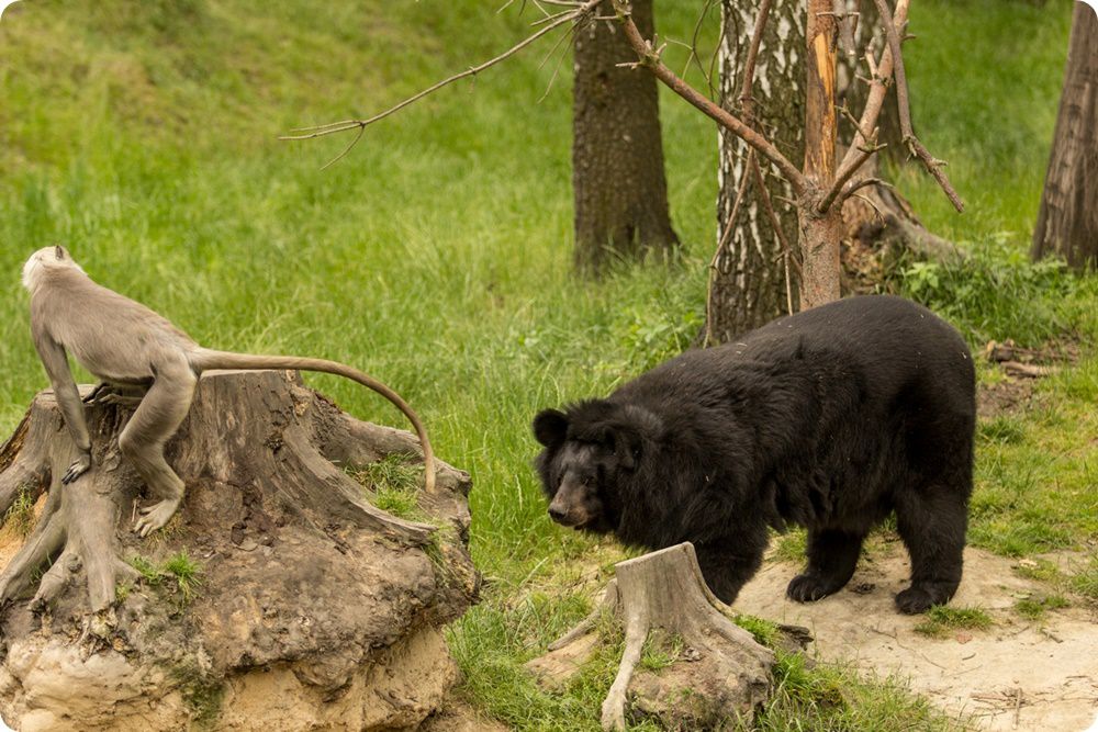 Örvös medve (Ursus thibetanus) és pusztai rókák (Vulpes corsac) az Amersfoort-i Állatkertben