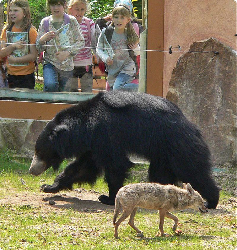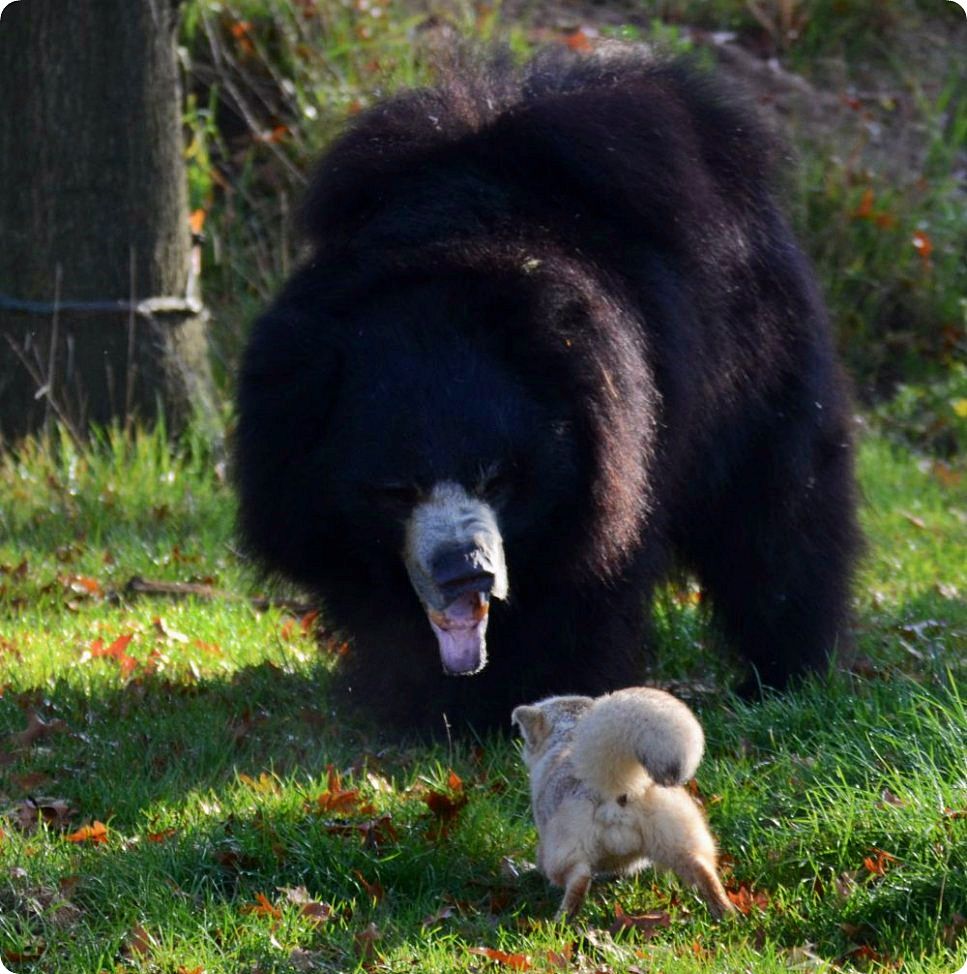 Ajakos medve (Melursus ursinus) és pusztai róka (Vulpes corsac) Hilvarenbeek-ben