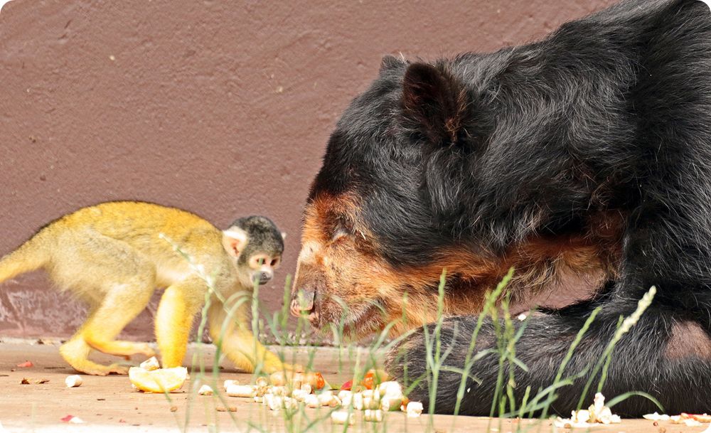 Pápaszemes medve (Tremarctos ornatus) és bolíviai mókusmajom (Saimiri boliviensis boliviensis) Antwerpenben