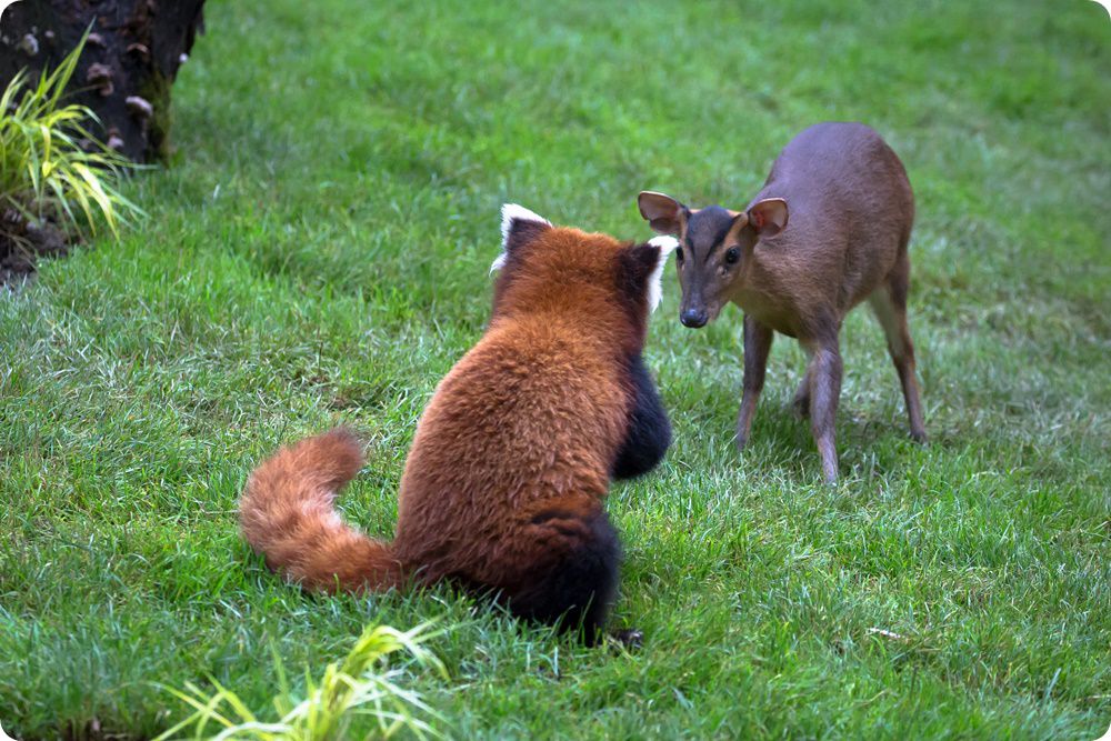 Vörös macskamedve v. kis panda (Ailurus fulgens) és indiai muntyákszarvas (Muntiacus muntjak)