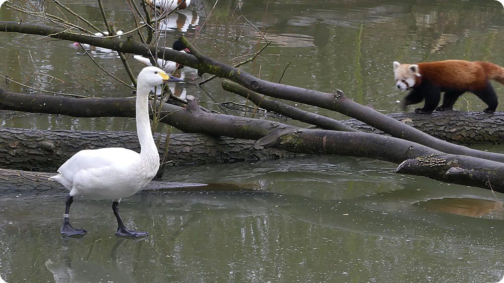 Nyugati vörös macskamedvék v. kis pandák (Ailurus fulgens fulgens), Reeves-muntyákszarvasok (Muntiacus reevesi), bütykös ásóludak (Tadorna tadorna) és kis hattyúk (Cygnus bewickii) társaskifutója