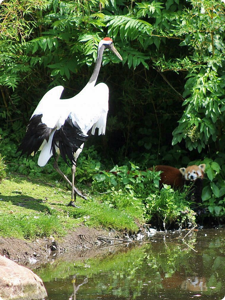 Nyugati vörös macskamedve v. kis panda (Ailurus fulgens fulgens) és mandzsu v. japán daru (Grus japonensis)
