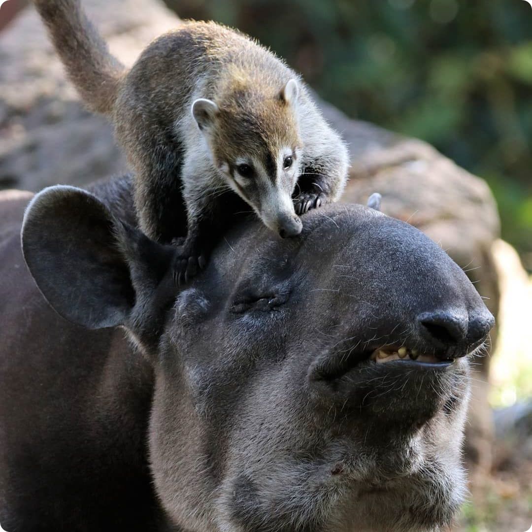 A Magdeburgi Állatkert Amazónia bemutatójában egy szokatlan társasbemutatóra bukkanhatunk, ahol vörösorrú ormányosmedvék (5.1) és fehérorrú ormányosmedvék (1.2) vegyesivarú csapata él dél-amerikai tapírokkal közösen. Mindkét koati faj szaporodik a bemutatóban. A külső kifutón az együttélés nem okoz problémát, az ormányosmedvék és tapírok idejük nagy részében nem foglalkoznak egymással. Néha előfordul, hogy a koatik vakaródznak vagy pihennek a tapírokon, sőt játék közben rájuk ugranak, mely „kényeztetés” láthatóan tetszik a nagytestű növényevőknek. Az ormányosmedvék továbbá fekvőhelyeket készetenk maguk számára a fákon, mely tovább növeli a fajok közötti elkülönülés lehetőségét. A fajkombináció a belső férőhelyen nem volt folytatható, mivel az ormányosmedvék arra „használták” a tapírokat, hogy azok hátáról kiugrottak a belső látogatói térbe, valamint az egész napos összezárás túlzott mértékű, vakaródzásban jelentkező „zaklatást” jelentett a nagyobb társbérlők irányába (RUSKE 2018, sz. k.).