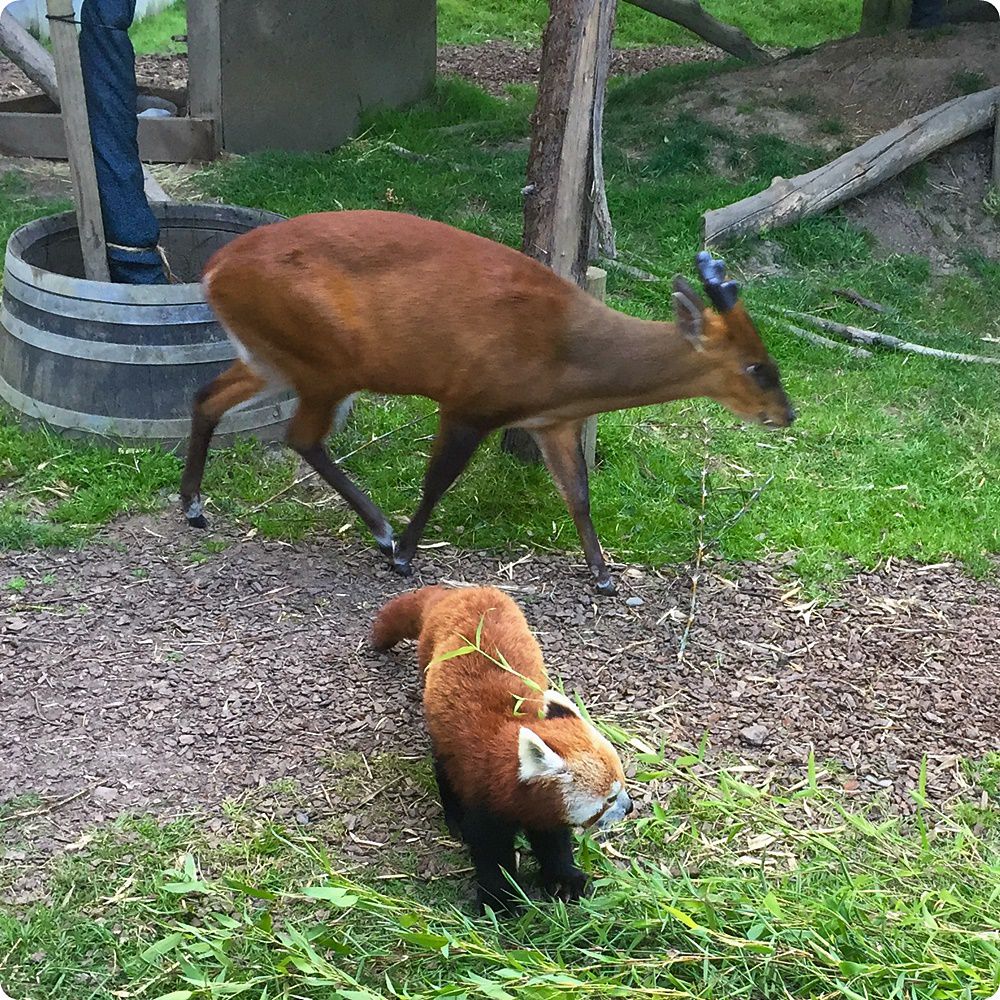 Nyugati vörös macskamedve v. kis panda (Ailurus fulgens fulgens) és kelet-kínai bóbitás szarvas (Elaphodus cephalophus michianus)