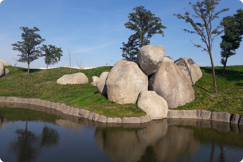 A játszóházat elhagyva, azonban tulajdonképpen már korábban, a víziló-bemutató előtti műszikla-boltívre helyezett tábla alatt áthaladva – a sziklaboltívre függesztett tábla tanúbizonysága szerint – megérkezünk a fiktív, 2018-ban alapított Momma Dunia Nemzeti Parkba (Momma Dunia National Park). A régi emmeni állatkert egyik legkiemeltebb, már-már ikonikusnak számító bemutatójának, a szavannakifutónak az újjászületését láthatjuk további utunk során, kiegészülve e központi kifutó köré rendeződött további bemutatók bejárásával. Tehát az Animazia játékvilágát elhagyva járjuk körbe tematikusan a területet. A centrális fekvésű szavannakifutó egyik oldalán húzódó kiterejedt tórendszer található, melynek a közepén hosszan átívelő, fából készült emelt gyaloghídon vezet tovább utunk. A tó egyben vizesárok funkcióját tölti be a híd jobb oldalán elnyúló, Oroszlánhegy (Leeuwenberg) elnevezésű kifutónál, ahol az oroszlánok (Panthera leo) hétfős családja fogadja a látogatókat. A bemutató elnevezése nem véletlen, hiszen az itt kiépített terjedelmes műszikla-tömeg a kelet-afrikai szavannák jellegzetes, erózió által legömbölyített, elsősorban gránitból keletkezett sziklaformációit, a kopjéket jeleníti meg. Az igen élethűen visszaadott sziklakibúvások kisebb „testvérei” a terület közelebbi és távolabbi pontjain, szomszédos kifutóin – így a szavannán és szurikátakifutón is – egyaránt előtűnnek, egységes tájképet alkotva a panorámában. Az oroszlánkifutó tava – amelybe jászkeszegek (Leuciscus idus) kerültek telepítésre – a gyaloghíd teljes hosszában határolóelemként funkcionál, és üvegbetekintő alkalmazása nélkül meglehetősen nagy távolságot tart a nagyragadozók és látogatók között. Habár az oroszlánok „testközelből” történő megfigyelése nem lehetséges, ezt kompenzálja a távoli, magas sziklákon pihenő oroszláncsalád idilli látványa.