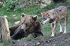 The most frequent association is the Grey Wolf & Brown Bear coexistence which have been tried in many institutions. Some accidents have also been reported: in one occasion a bear cub was killed by full-grown wolves as it was strolled to a bear-proof area, furthermore, another time it happened that a lonely bear was attacked by a pack of wolves. On the contrary Alaskan Tundra Wolf pups were killed by Kodiak Bears in a 3400 m² exhibit in Wildpark Lüneburger Heide...